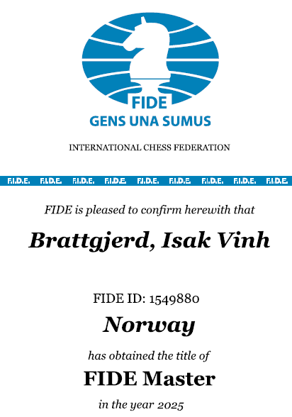 FM-tittel til Isak Stian Hjoberg 2. september 2025 Isak har passert 2300 i rating og OSSU gratulerer med FM-tittelen! Tweet Pin It Leave a Reply Avbryt svar Lagre mitt navn, e-post og nettside i denne nettleseren for neste gang jeg kommenterer. Δ
